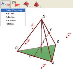 Unnecessary points have been hidden and the bottom triangle has been shown for clarity. Find the reflection of each of the tetrahedron vertices in point L. Use the tool shown and first select point L. The reflection of A is A’, etc. These points, together with the original tetrahedron vertices, form the vertices of a cube. |