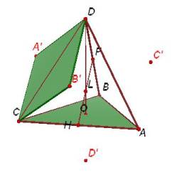 Create a segment joining any two opposite vertices (segment FH is drawn here) and also a segment joining O to the top vertex D. Point L is the intersection of these segments and is the centre of the tetrahedron. |