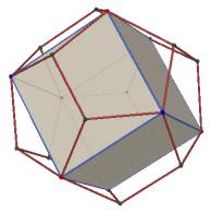 These twelve points, together with the eight cube vertices, form the vertices of a regular dodecahedron. Join the points with segments to form the framework of the dodecahedron, and create polygons for the faces. |