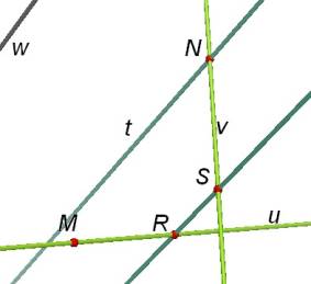 You may want to hide the two planes you have just constructed. Construct a line t parallel to w passing through N (or any other arbitrary point on v). Now construct the plane containing the lines v and t (the blue plane with white holes). This plane must contain the required line. |
