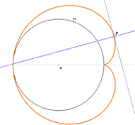 Cabri Geometry II Plus is also capable of representing intersections with loci. The example shows a cardioid, the locus of point p with m varying around the circle.We can thus build the intersections of the curve with a small circle, centered about p, and thus obtain a good estimate of the tangent and normal of the curve p.