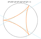The ‘Coordinates or Equation’ tool can now be used for loci. The equations are determined by digital methods as algebraic curves of up to and including degree 6. If the equation of a locus is considered to exceed this functional range, the equation cannot be determined. The calculations are carried out to the precision of the machine itself (64 bits), thus numerical errors may appear.The following example shows the equation of an asteroid in a circle.